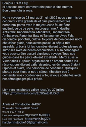 Si comme nous vous avez envie de découvrir ce merveilleux pays qu’est Madagascar, je vous recommande vivement Gérard avec qui on ne s’est jamais ennuyé.